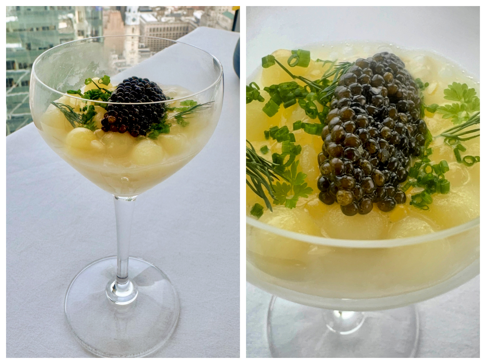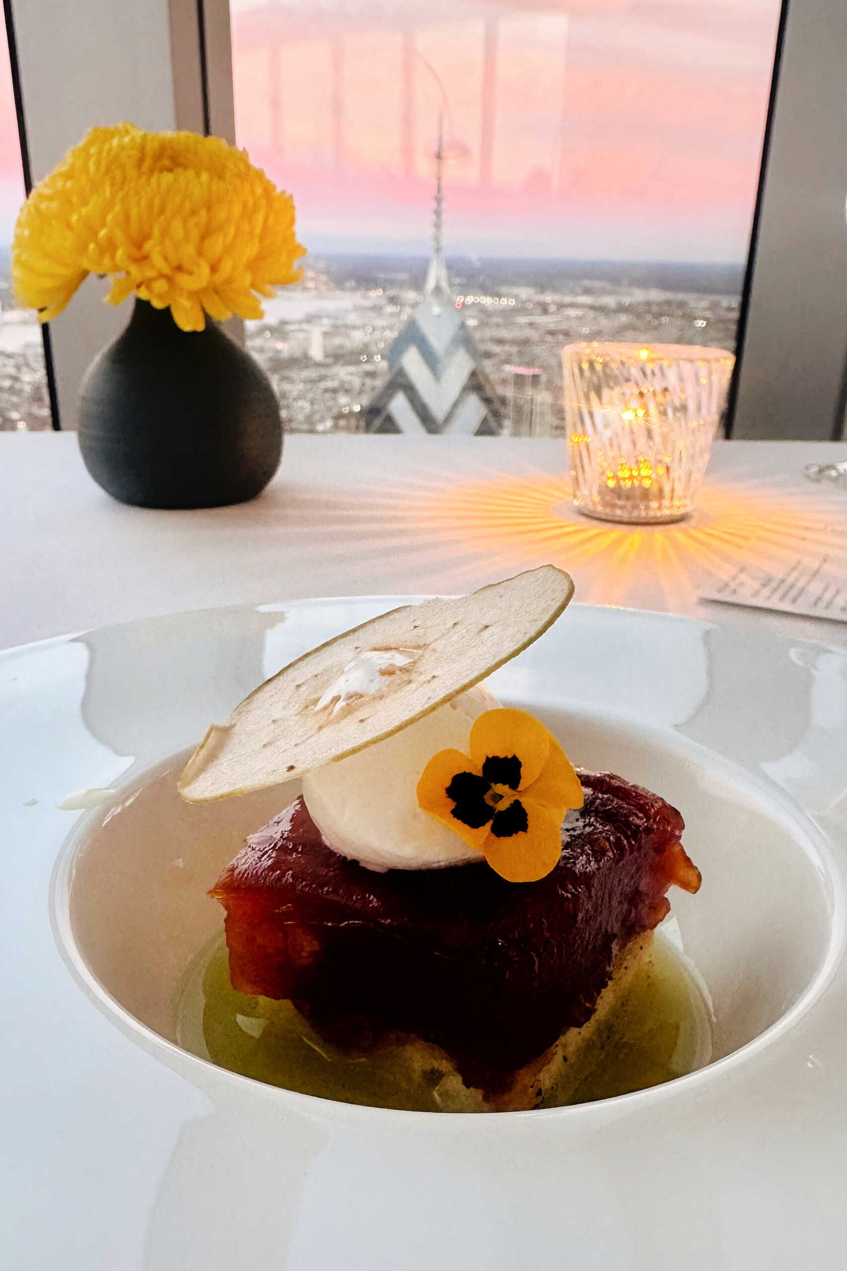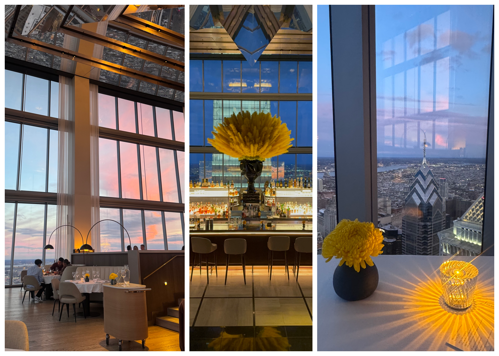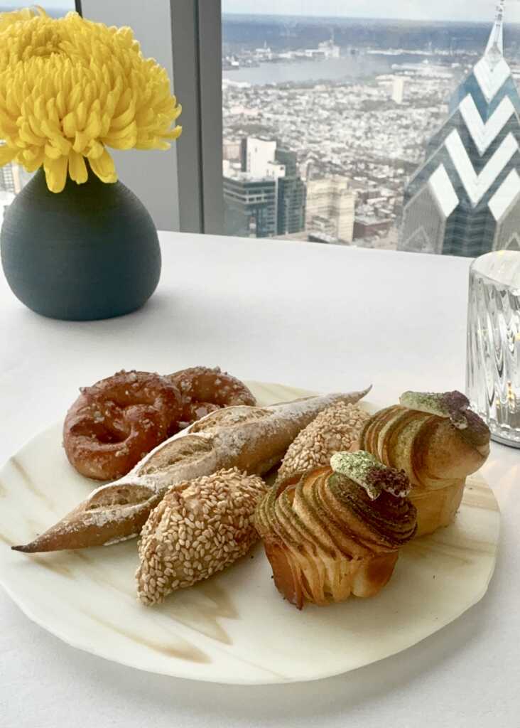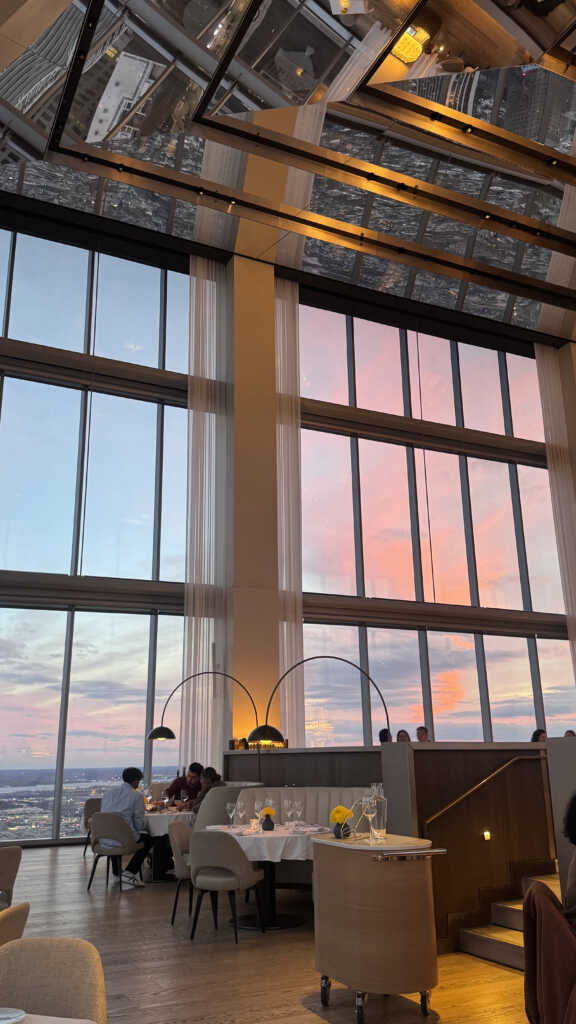 The view itself is something you’d pay for anywhere else. Food aside, it’s a luxurious alternative to skyscraper views at tourist attractions. Floor-to-ceiling windows stretch endlessly upward, framing the Philadelphia skyline in soft pastels that shift as the evening unfolds – from daylight clarity to a kind of watercolor sunset that almost doesn’t feel real. We arrived just before 6pm, which in April may very well be the perfect time to enjoy the skyline at daytime and watch as it transforms to night. The room itself mirrors the sky: airy, luminous, and quietly dramatic. (Quite literally, the mirrored ceiling is reflective by design.) Even before the first bite arrives, you get the sense that this is going to be an experience that lives as much in memory as it does on the plate.