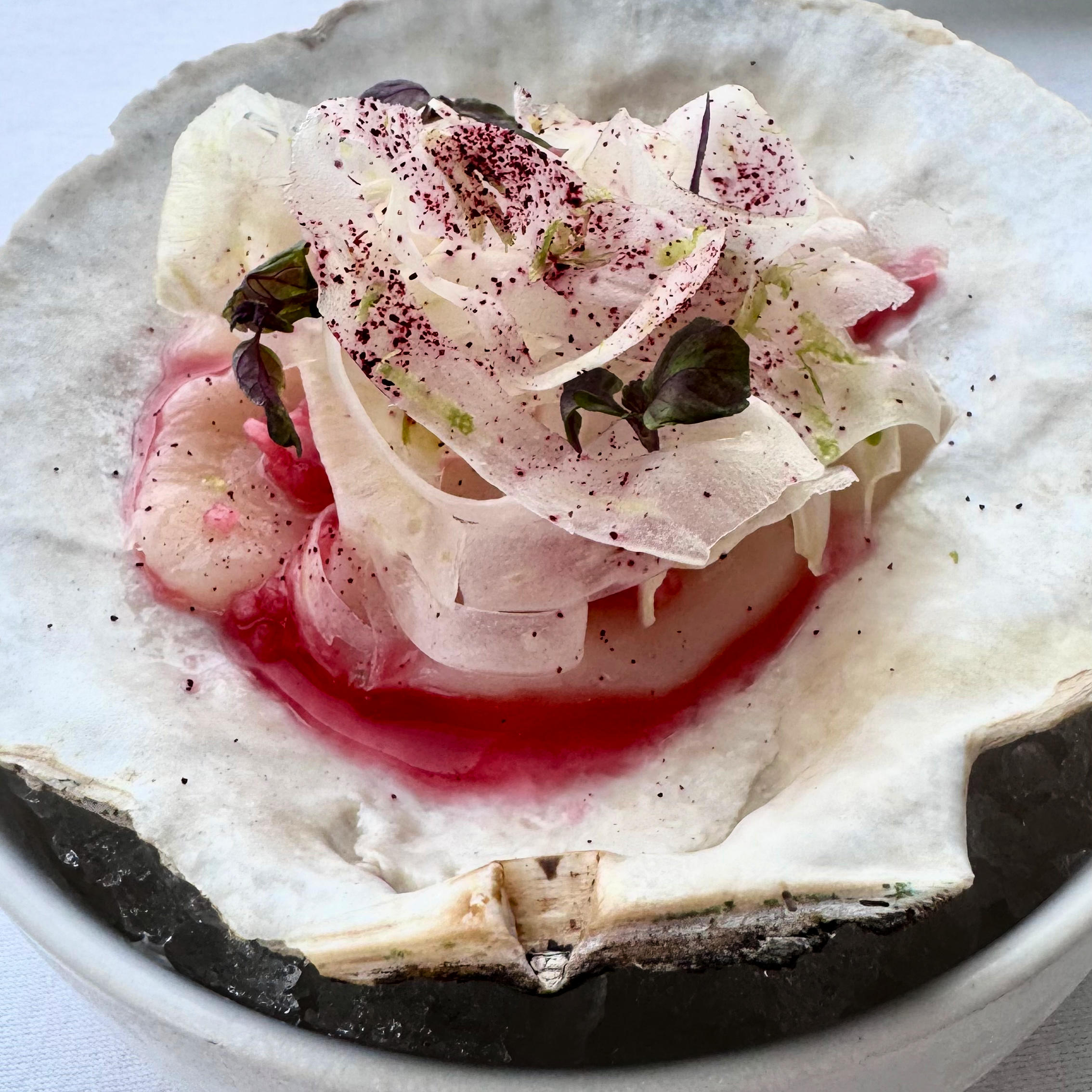 The scallop carpaccio leaned into brightness, with pickled rhubarb and shaved fennel cutting through the natural sweetness of the shellfish. Banana oil and shiso added intrigue it felt effortless but clearly wasn’t. Was this my favorite? It may have been. But I haven’t mentioned the bread. Bread can also be a favorite.